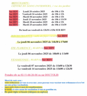 Les infirmières du Centre de santé infirmier de Mouchamps vous vaccinent à Rochetrejoux le jeudi 6 novembre de 14h à 17h à la salle du foyer rural.